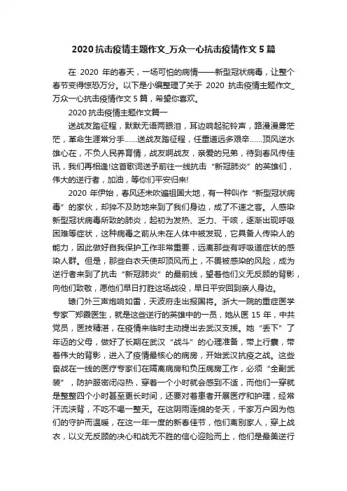 2020抗击疫情主题作文篇一送战友踏征程,默默无语两眼泪,耳边响起驼铃声,路漫漫雾茫茫,革命生涯常分手……送战友踏征程,任重道远多艰辛……顶风逆水雄心在,不负人民养育情,战友啊战友,亲爱的兄弟,待到春风传佳讯,我们再相逢!这首歌词送予前往一线抗击“新冠肺炎”的英雄们,伟大的逆行者,加油,等你们平安归来!2020年伊始,春风还未吹遍祖国大地,有一种叫作“新型冠状病毒”的家伙,却猝不及防地来到了我们身边,成了不速之客。
