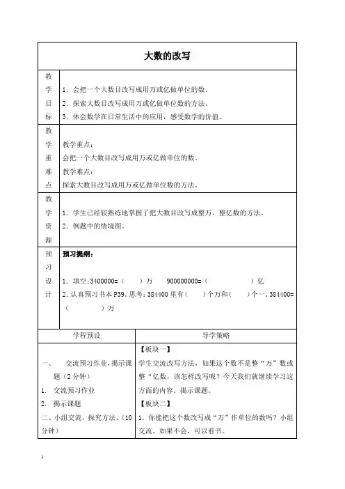 二、教学内容:1. 大数的概念介绍2. 科学计数法和普通计数法的区别和联系3. 大数的改写方法和步骤三、教学过程:第一步:引入新课(10分钟)通过生活中的例子引出大数的概念,让学生对大数有一个初步的认识。