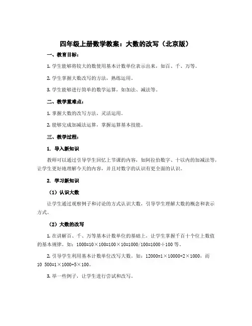 四年级上册数学教案:大数的改写(北京版)一、教育目标:1.学生能够将较大的数使用基本计数单位表示出来,如百、千、万等。