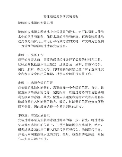 三、调试1、检漏(防止主体在运输过程中震动开裂)A、用清水或原液充满过滤器,检查外部是否漏液。