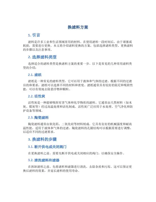 文档下载后可定制随意修改,请根据实际需要进行相应的调整和使用,谢谢!并且,本店铺为大家提供各种各样类型的实用资料,如教育随笔、日记赏析、句子摘抄、古诗大全、经典美文、话题作文、工作总结、词语解析、文案摘录、其他资料等等,如想了解不同资料格式和写法,敬请关注!Download tips: This document is carefully compiled by theeditor. I hope that after you download them,they can help yousolve practical problems. The document can be customized andmodified after downloading,please adjust and use it according toactual needs, thank you!In addition, our shop provides you with various types ofpractical materials,such as educational essays, diaryappreciation,sentence excerpts,ancient poems,classicarticles,topic composition,work summary,word parsing,copy excerpts,other materials and so on,want to know different data formats andwriting methods,please pay attention!更换滤料过滤罐操作流程如下:1. 关闭过滤罐:首先,确保过滤罐处于停止工作状态,关闭进出口阀门,断开过滤罐的电源。
