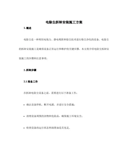 3. 安装步骤3.1 准备工作在安装电除尘设备之前,需要进行以下准备工作:•确保安装环境符合设备要求,包括空间、电源、排放等;•准备好所需的安装工具和材料;•检查设备的配件和滤料是否齐全。