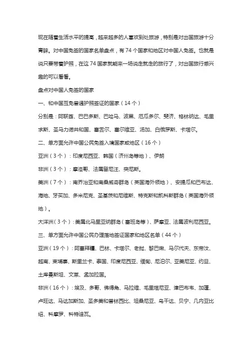 •2012年最新中国因私护照免签证落地签证国家(本材料依照互联网公布资料整理,仅供个人参考)••免签证国家•Africa 非洲:共十四个国家和地域Benin 贝宁共和国:落地签证,3个月;免费Burundi 布隆迪:落地签证(若是所在国没有的布隆迪使领馆的话),费用40美元(停留72小时),90美元(停留时刻超过72小时少于一个月)。