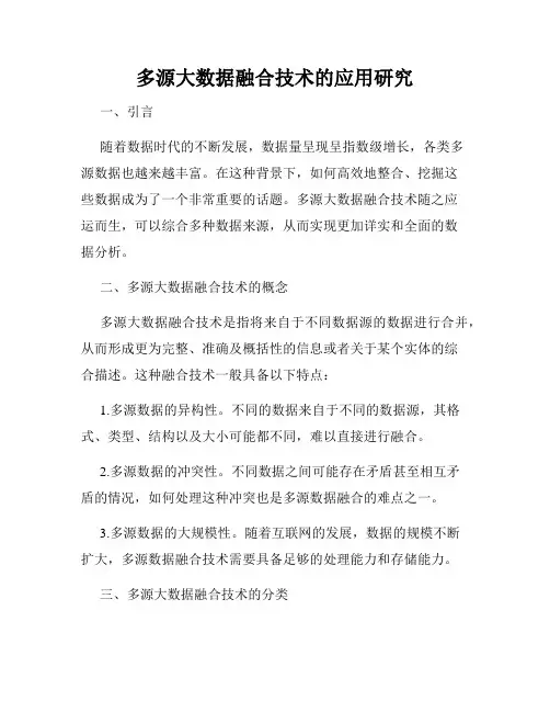 二、多源大数据融合技术的概念多源大数据融合技术是指将来自于不同数据源的数据进行合并,从而形成更为完整、准确及概括性的信息或者关于某个实体的综合描述。