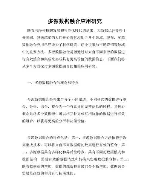 四、多源大数据融合技术的应用多源大数据融合技术可以应用于多个领域,例如:1.金融领域银行、证券、保险等金融机构通常需要从不同数据源中汇总数据,如交易量、客户信息、市场趋势等,进行分析预测。