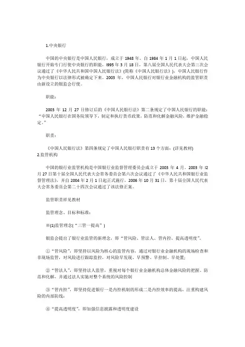1.中央银行中国的中央银行是中国人民银行,成立于1948年。