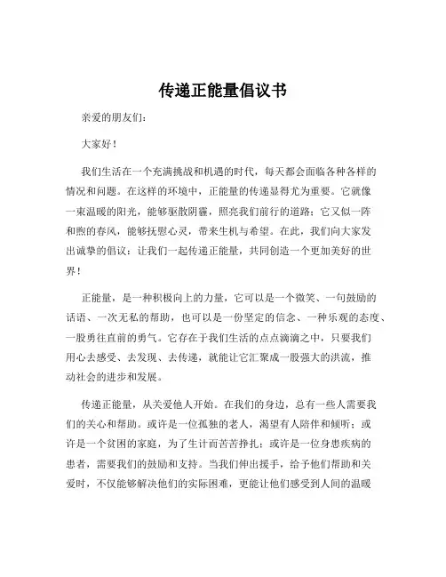 传递正能量倡议书亲爱的朋友们:大家好!我们生活在一个充满挑战和机遇的时代,每天都会面临各种各样的情况和问题。