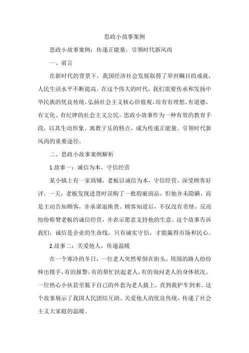 二、思政小故事案例解析1.故事一:诚信为本,守信经营某小镇上有一家商铺,老板以诚信为本,守信经营,深受顾客好评。