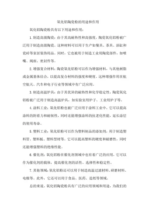2. 用作陶瓷材料的增强剂:由于氧化铝具有高的硬度和耐热性,可以用作陶瓷材料的增强剂,提高陶瓷材料的力学性能和耐高温性能。