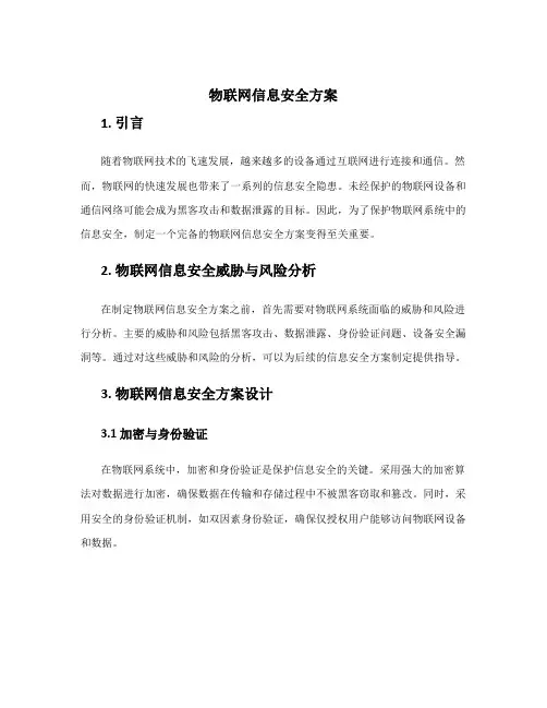 2. 物联网信息安全威胁与风险分析在制定物联网信息安全方案之前,首先需要对物联网系统面临的威胁和风险进行分析。