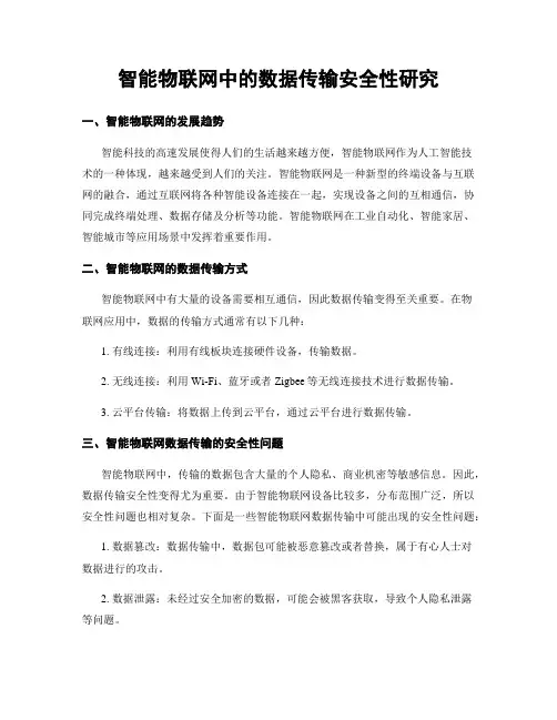 三、智能物联网数据传输的安全性问题智能物联网中,传输的数据包含大量的个人隐私、商业机密等敏感信息。