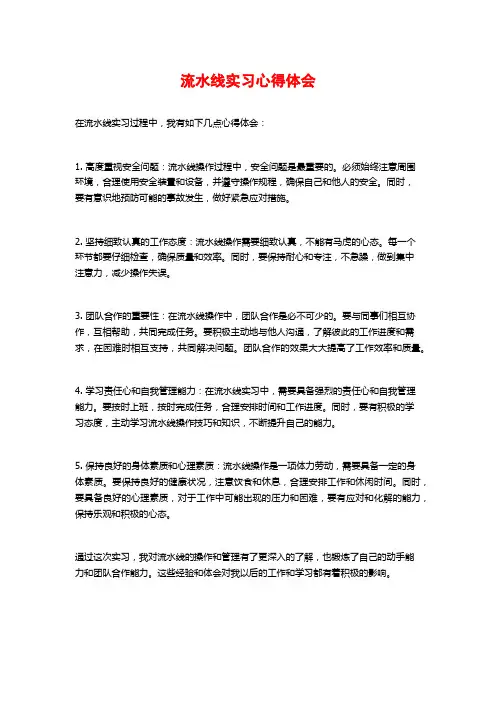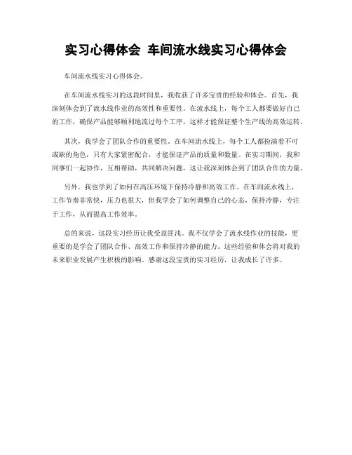 四、实习收获1. 深入了解流水线生产流程通过实习,我深入了解了流水线工厂的生产流程、工艺及管理模式。