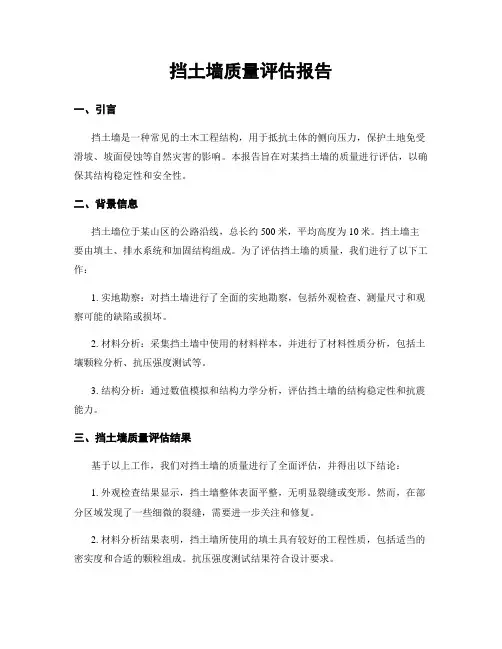 挡土墙质量评估报告一、引言挡土墙是一种常见的土木工程结构,用于防止土壤侵蚀和土体滑坡等地质灾害。