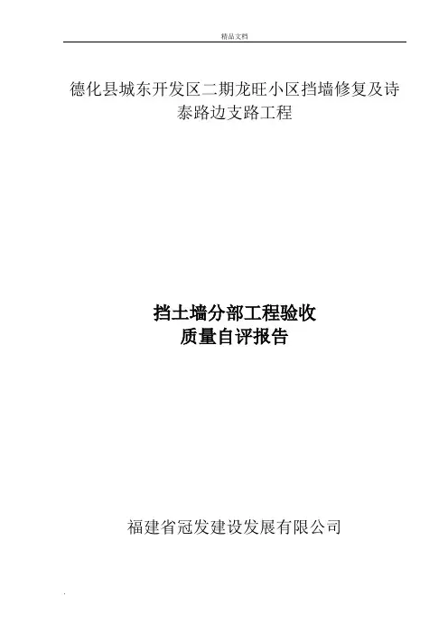 德化县城东开发区二期龙旺小区挡墙修复及诗泰路边支路工程挡土墙分部工程验收质量自评报告福建省冠发建设发展有限公司目录工程概况 (2)1、参建单位 (2)2、试验检测单位 (2)二、施工记录、验收资料执行标准、规范及使用参考资料情况 (2)三、挡土墙分部工程合同完成情况及主要设计变更 (2)1、合同完成情况 (2)2、主要设计变更 (2)四、挡土墙分部工程施工重点、难点控制及主要技术措施 (2)1、材料管理 (3)2、拌和 (3)3、运输 (3)4、养生 (3)5、混合料离析 (3)五、挡土墙分部工程质量控制情况评价 (4)1、进场原材料质量控制情况 (4)2、施工检测 (4)六、建设单位抽查和检测情况 (5)七、质保资料审查情况 (5)八、工程实体观感质量 (5)九、挡土墙分部工程验收资料准备情况和资料整改 (5)1、挡土墙分部工程验收资料编写、整理、归档、立卷 (5)2、挡土墙分部工程整料自检和整改情况 (6)十、挡土墙分部工程质量评定情况 (6)工程概况本工程分为两个地段:分别为诗泰路边支路工程;龙旺小区挡墙水毁修复工程。