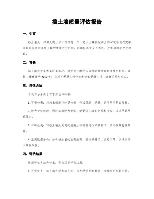 挡土墙质量评估报告一、引言挡土墙是一种常见的土木工程结构,用于抵抗土体的侧向压力,保护土地免受滑坡、坡面侵蚀等自然灾害的影响。