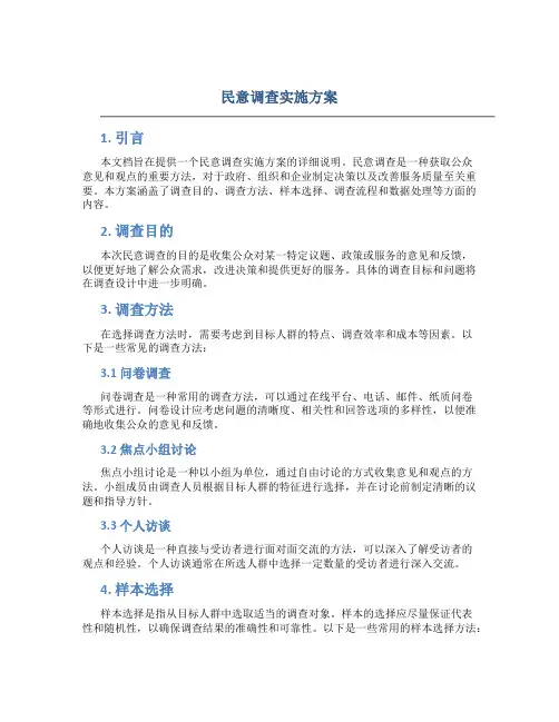 民意调查实施方案一、背景介绍民意调查是政府制定政策、企业开展市场营销、学术研究等领域中常用的调查手段,通过对社会大众的观点、态度和行为进行系统的调查和分析,以获取有关问题的信息和数据。