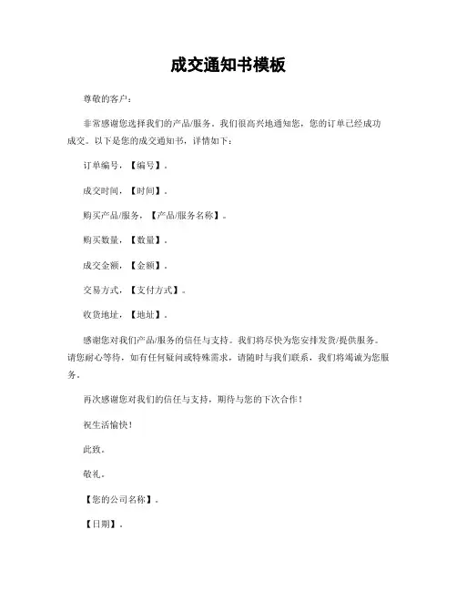二、成交通知书的定义和内容成交通知书是指在招投标过程中,采购单位根据招标结果,向投标人发出的正式通知书,通知投标人该标段的成交情况。