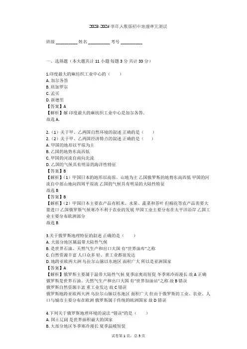 2023-2024学年人教版初中地理单元测试班级 __________ 姓名 __________ 考号 __________一、选择题(本大题共计11小题每题3分共计33分)1.图中甲、乙、丙、丁中代表马六甲海峡的是()A. 甲B. 乙C. 丙D. 丁【答案】D【解析】马六甲海峡位于马来半岛与苏门答腊岛之间沟通太平洋与印度洋图中丁所示的是马六甲海峡2.印度软件外包产业的发源地是()A. 新德里B. 孟买C. 班加罗尔D. 加尔各答【答案】C【解析】班加罗尔是印度南部城市是印度软件外包产业的发源地卡纳塔克邦的首府印度第三大城市人口约650万人印度在1947年独立以后班加罗尔发展成重工业的中心高科技公司在班加罗尔的成功建立使其成为印度信息科技的中心俗称“印度硅谷” 班加罗尔是印度科技研究的枢纽其中的印度科学学院是印度历史最为悠久的大学和研究所故选C3.(1)乘坐K3次列车沿途可以看到()①世界最深的湖泊﹣﹣贝加尔湖②亚欧两洲分界线﹣﹣乌拉尔山脉③俄罗斯的母亲河﹣﹣伏尔加河④莫斯科的居民以黄种人为主3.(2)K3次列车一年中有8个月需要供暖供暖时间长主要是由于沿线大部分地区()A. ①②③B. ①②④C. ①③④D. ②③④【答案】A【解析】世界上最深、蓄水量最大的淡水湖是贝加尔湖位于中西伯利亚高原铁路线经过沿岸地区亚欧两洲分界线﹣﹣乌拉尔山、俄罗斯的母亲河﹣﹣伏尔加河都是铁路线经过沿岸地区莫斯科居民主要是白种人故A正确符合题意【答案】C【解析】读图可知 K3次列车经过纬度较高的地区大部分时间气温较低因此一年中有8个月需要供暖4.(1)关于甲、乙两国自然环境的叙述正确的是()4.(2)关于甲、乙两国经济特点的叙述正确的是()A. 甲国的地形以平原为主B. 乙国的地势西高东低C. 甲国的气候具有明显的海洋性特征D. 乙国的河流结冰期短【答案】C【解析】(1)图中的甲乙分别是日本和俄罗斯日本地形以山地和丘陵为主俄罗斯地势东高西低日本主要是温带季风气候和亚热带季风气候带有明显的海洋性特征俄罗斯由于纬度高河流结冰期长故选C【答案】B【解析】(2)甲乙分别是日本和俄罗斯日本国土面积狭小农业欠发达农产品只能自给俄罗斯纬度高气候寒冷不利于农业发展日本的工业主要分布于太平洋沿岸俄罗斯工业分布于内陆主要靠近矿产产地故选B5.关于东南亚自然环境的描述正确的是()A. 以热带雨林气候和热带草原气候为主B. 中南半岛山环水绕地势南高北低C. 马来群岛火山地震频繁D. 地处亚洲与非洲、太平洋与印度洋的“十字路口”【答案】C【解析】解中南半岛以热带季风气候为主马来群岛大部分地区属于热带雨林气候故A 错误中南半岛山河相间、纵列分布地势北高南低故B错误马来群岛位于亚欧板块、太平洋板块、印度洋板块的交界处地壳活跃多地震故C正确东南亚处在亚洲与大洋洲、印度洋与太平洋的“十字路口” 故D错误.故选 C.6.(1)下列是同学们对俄罗斯河流特征的说法正确的是()6.(2)有结冰现象的河流在河流融冻期间由较低纬度向较高纬度的河段容易发生凌汛以下河流不容易发生凌汛的是()6.(3)同学们一致认为俄罗斯的河流中伏尔加河的航运价值最大以下说法不能支持该观点的是()A. 都自南向北流B. 都属于外流河C. 勒拿河结冰期最短D. 鄂毕河中下游水流平稳【答案】D【解析】俄罗斯河流众多大多自南向北流大部分属于外流河少部分为内流河如伏尔加河伏尔加河结冰期最短故ABC错误鄂毕河中下游地势低平水流平稳故D正确【答案】D【解析】凌汛是指冰坝阻塞河道造成水位急剧上升的现象多发生于河流从较低纬度流向较高纬度的河段勒拿河、鄂毕河、叶尼塞河由较低纬度向较高纬度流在河流融冻期间容易发生凌汛伏尔加河由较高纬度向较低纬度流在河流融冻期间不容易发生凌汛【答案】A【解析】伏尔加河是俄罗斯的母亲河流经平原流速慢降水较多流量丰富结冰期较短通航时间更长流经地区人口稠密、经济发达运输需求量大是俄罗斯航运价值最大的河流故A符合题意7.(2019·绥化市中考真题)东南亚的主要粮食作物是()A. 青稞B. 玉米C. 小麦D. 水稻【答案】D【解析】东南亚绝大部分位于热带气候湿热各国普遍种植水稻稻米是当地居民的主要粮食也是传统的出口产品故选项D符合题意故选D8.关于印度的叙述不正确的是()A. 印度服务外包产业发展迅速B. 南亚经济水平最高、人口最多的国家C. 印度地处热带、亚热带全年高温多雨D. 北邻中国西北与巴基斯坦毗邻【答案】C【解析】A.印度服务外包产业发展迅速被称为“世界办公室” 故A选项正确B.因素是南亚经济水平最高、人口最多的国家故B选项正确C.印度地处热带、亚热带以热带季风气候为主全年高温分旱雨两季故C选项错误 D.印度北邻中国西北与巴基斯坦毗邻故D选项正确故选C9.俄罗斯幅员辽阔地跨东西半球和亚欧大陆读图下列关于俄罗斯地理特征的描述正确的是()A. 民族构成单一的欧洲国家B. 平原面积广大地势东高西低C. 东部地区河流众多航运价值高D. 重工业发达多沿海分布【答案】B【解析】A、俄罗斯是多民族国家主要的民族是俄罗斯族传统上属于欧洲国家故A不符合题意B、俄罗斯地势东高西低地形以平原和高原为主其中平原约占全国总面积的70%.故B符合题意C、俄罗斯东部地区河流众多但由于纬度高气候寒冷河流的结冰期长航运价值不高故C不符合题意D、俄罗斯重工
