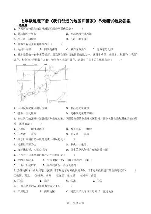 七年级地理下册《我们邻近的地区和国家》单元测试卷及答案一、选择题1.下列河流与注入的海洋或湖泊组合不正确的是()A.伏尔加河—里海B.叶尼塞河—北冰洋C.湄公河—印度洋D.长江—太平洋2.日本工业区主要集中分布于()A.九州岛南部B.四国岛南部C.濑户内海沿岸D.北海道岛北部3.日本是我们一衣带水的邻邦,是我国主要出境旅游目的地之一。