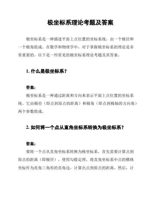 2. 如何将一个点从直角坐标系转换为极坐标系?答案:要将一个点从直角坐标系转换为极坐标系,首先需要计算点到原点的距离(即极径)。