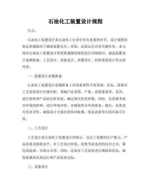 二、设计基本原则1. 安全原则石油化工装置设计应始终以安全为首要原则,确保设备和工艺的安全运行。