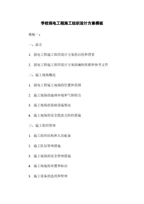 学校弱电工程施工组织方案一、总体概况学校弱电工程施工组织方案是为了贯彻落实国家有关建筑工程法规和规范标准,确保工程质量,保障施工安全,提高施工效率,最大限度满足用户需求而制定的。