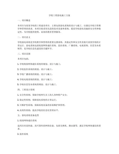 学校工程弱电施工方案范文一、项目概述本工程为某某学校弱电工程施工项目,工程包括智能化教学设备、校园网络、监控系统、广播系统等。