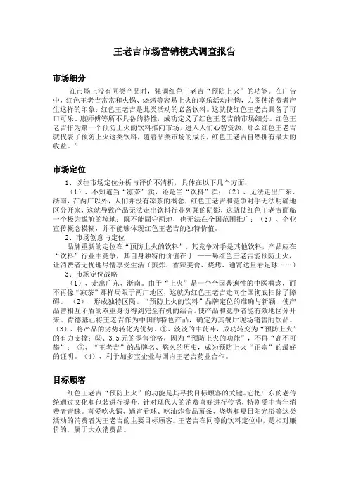 一、市场规模1.1 市场概况王老吉所在的中草药饮料市场是一个庞大而竞争激烈的行业。
