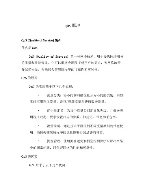 QoS 的原理QoS 的实现基于以下几个原理:•流量分类:将不同的网络流量分为不同的类别,例如实时应用程序流量、音频/视频流量和普通数据流量。