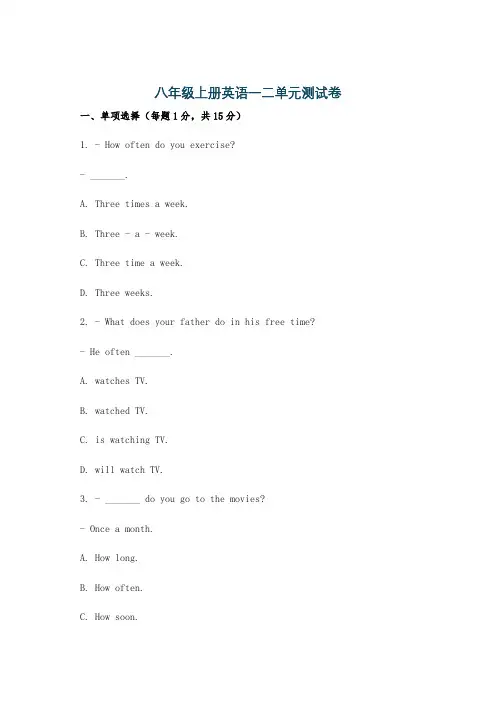 八年级上册英语一二单元测试卷一、单项选择(每题1分,共15分)1. - How often do you exercise?- _______.A. Three times a week.B. Three - a - week.C. Three time a week.D. Three weeks.2. - What does your father do in his free time?- He often _______.A. watches TV.B. watched TV.C. is watching TV.D. will watch TV.3. - _______ do you go to the movies?- Once a month.A. How long.B. How often.C. How soon.D. How far.4. - Is Tom at home?- No, he _______ to town.A. has been.B. has gone.C. goes.D. will go.5. - _______ is it from your home to school? - It's about two kilometers.A. How long.B. How far.C. How soon.D. How often.6. - _______ you _______ your homework yet? - Yes, I _______ it ten minutes ago.A. Did; do; finished.B. Have; done; have finished.C. Have; done; finished.D. Will; do; finish.7. - I like the movie very much.- I like it, too. It's so _______.A. boring.B. interested.C. interesting.D. bored.8. - There _______ a football match on TV this evening. - Really? That's great!A. is going to have.B. is going to be.C. are going to be.D. are going to have.9. - How about _______ a party this weekend?- Good idea!A. have.B. to have.C. having.D. has.10. - What's your sister like?- She's _______.A. a singer.B. fine.C. tall and thin.D. at home.11. - Can you play the guitar?- No, I _______. But I can play the piano.A. can.B. can't.C. don't.D. do.12. - _______ is your favorite subject?- English.A. What.B. When.C. Why.D. How.13. - I'm thirsty. I want to drink some _______.A. bread.B. meat.C. water.D. apples.14. - How many _______ are there in the zoo?- There are about fifty.A. monkey.B. monkeys.C. monkeies.D. monkeyes.15. - Let's go for a walk, _______?- Good idea.A. will you.B. don't we.C. shall we.D. won't you.二、完形填空(每题1分,共10分)I have a good friend. His name is Tom. He is a nice boy, but he eats too 1 and doesn't like sports.He has a big 2 every morning. He has four eggs, 3 of bread with butter and a big glass of milk for it. 4 lunch, he eats two hamburgers, a lot of French fries 5 some chicken. He drinks a lot of Coke or soda too. For dinner, he likes beef and salad.He 6 eats beef, chicken, hamburgers and eggs. He likes ice - cream, Coke and soda 7.Too much food is not 8 for health. So Tom is very 9. Now he wants to 10 some weight. He starts to do sports and eat healthy food.1. A. many.B. much.C. some.D. any.2. A. breakfast.B. lunch.C. dinner.D. supper.3. A. much.B. many.C. lots.D. lot.4. A. For.B. On.C. In.D. Of.5. A. for.B. and.D. but.6. A. often.B. never.C. seldom.D. not.7. A. two.B. to.C. also.D. too.8. A. bad.B. good.C. important.D. hungry.9. A. healthy.B. fit.C. fat.D. thin.10. A. lose.B. find.D. use.三、阅读理解(每题2分,共30分)A.Most children like to watch TV. It's very interesting. By watching TV they can see and learn a lot and know many things about their country and the world. Of course, they can also learn over the radio. But they can learn better and more easily with TV. Why? Because they can hear and watch at the same time. But they can't see anything over the radio.TV helps to open children's eyes. TV helps to open their minds, too. They learn newer and better ways of doing things. They may find the world is now smaller than before.Many children watch TV only on Saturday or Sunday evening. They are always busy with their lessons. But a few children watch TV every night. They go to bed very late. They can't have a good rest. How about you, my young friend?1. A few children go to bed late because they _______.A. are busy with their lessons.B. do their homework.C. watch TV.D. listen to the radio.2. Children can't see anything _______.A. in the radio.B. on the radio.C. on TV.D. by watching TV.3. TV helps to open children's _______.A. eyes and minds.B. minds.C. eyes or minds.D. eyes.4. _______ children watch TV only on Saturday or Sunday evening.A. A lot.B. Much.C. A lot of.D. A little.5. Children can study better and more easily with TV because _______.A. they like to watch TV.B. they can hear at the same time.C. they can watch at the same time.D. they can hear and watch at the same time.B.My name is Jack. I am a pupil of Grade One. I'm in No.1 Middle School. On weekdays I get up at six o'clock. I have breakfast at seven and then I go to school by bike. We begin our class at eight o'clock in the morning. We have four classes in the morning and three in the afternoon.At noon, I have lunch at home. Classes are over at four fifteen in the afternoon. After class, we often play football in the playground. I go home at about five.I have dinner at about six thirty in the evening. I do my homework at seven thirty.At weekends, I watch TV. I often go to bed at ten o'clock.1. Jack is a pupil in _______.A. Class One.B. Grade One.C. Class Two.D. Grade Two.2. Jack gets up at _______ in the morning on weekdays.A. five.B. six.C. seven.D. eight.3. After class they often play _______ in the playground.A. volleyball.B. basketball.C. football.D. ping - pong.4. Jack has dinner at _______ in the evening.A. five.B. six.C. six thirty.D. seven.5. At weekends, Jack often _______.A. does his homework.B. watches TV.C. goes to bed.D. plays football.C.There are many different kinds of animals on the earth (地球). We can see some of them in the zoo. Koalas come from Australia. They are quiet, friendly and cute. They sleep during the day, but at night they get up and eat leaves. Pandas are from China. They are beautiful and shy. They like to eat bamboo (竹子) leaves. Lions are from Africa. They are exciting, but a little scary. Tigers are from India and China. They are very strong and dangerous. Elephants are from Thailand. They are smart. They like to playwith their trunks (象鼻). Dolphins are very intelligent animals. They live in the ocean (海洋) and like to jump out of the water to play.1. Koalas come from _______.A. Australia.B. China.C. Africa.D. India.2. Which animals are beautiful and shy?A. Lions.B. Pandas.C. Koalas.D. Elephants.3. Tigers are from _______