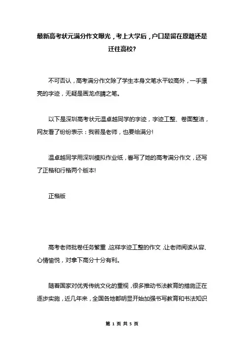 最新高考状元满分作文曝光,考上大学后,户口是留在原籍还是迁往高校?不可否认,高考满分作文除了学生本身文笔水平较高外,一手漂亮的字迹,无疑是画龙点睛之笔。