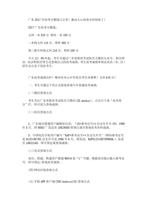 广东2017年高考分数线已公布!激动人心的查分时刻来了!2017广东高考分数线:文科一本520分理科一本485分二本线文科418分,理科360分第三批专科线文科210分,理科200分今天12:00时起,考生可通过广东省教育考试院官方微信公众号、相关网站、电话和短信等方式查询自己的高考成绩。