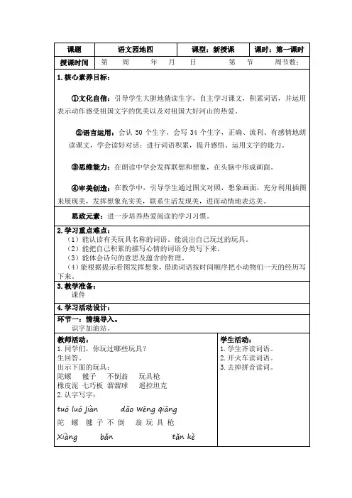 四、教具与学具准备1. 教具:多媒体设备、课文插图、生字卡片等。