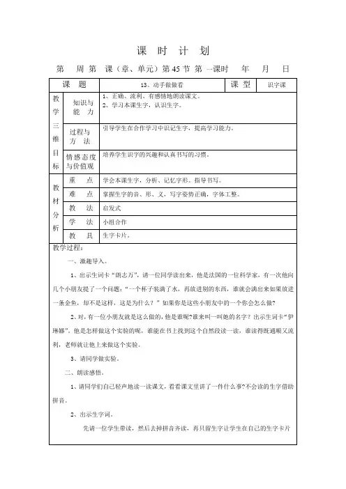 教学过程第一课时教学内容1、初步感知课文大意,认读识记生字。