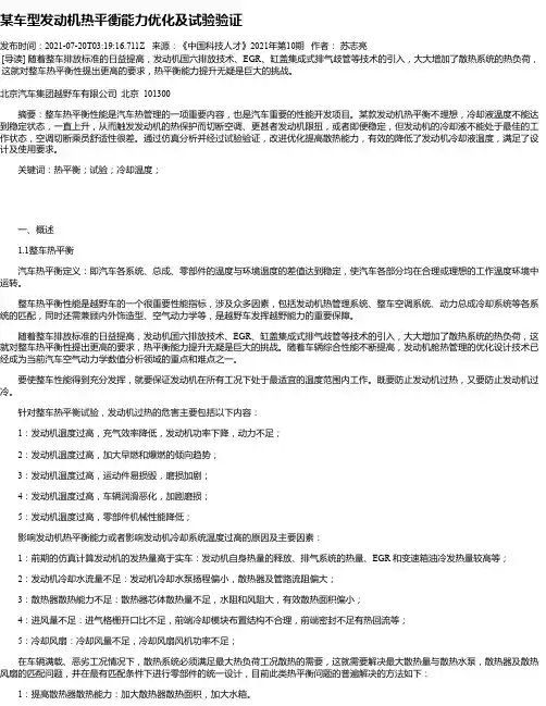 北京汽车集团越野车有限公司北京 101300摘要:整车热平衡性能是汽车热管理的一项重要内容,也是汽车重要的性能开发项目。