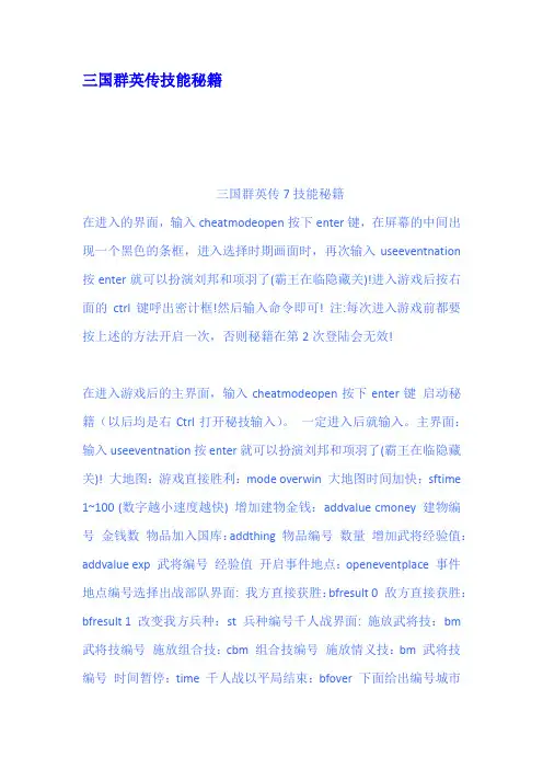 一、大地图秘籍(在大地图下使用)二、千人战秘籍:选择出战部队画面时用三、千人战秘籍:进入战场画面时用四、三国群英传7特别秘籍:在选择时期画面时用可在“霸王再临”时期中扮演高祖刘邦或霸王项羽:useeventnation注意事项:1、如果打cheatmodeopen按enter无法出现黑色条A、代表输入错误~请按[ESC键]再重新打一次B、可能你输入法没变更为英文2、秘籍模式中~要重覆呼叫出黑色横条A、直接按Ctrl键即可(键盘右侧)~而左方那键无法使用3、黑色横条输入秘籍时~数字间需打空格才能成立A、举例幼麒麟一只addthing(空格)225(空格)1addthing=纳入道具秘籍225=幼麒麟编号1=1只注:部分秘籍在破解版下无效。