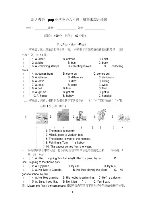 新人教版pep小学英语六年级上册期末综合试题姓名:班级:分数(满分:100分时间:60分钟)听力部分(满分45分)一、听录音, 选出跟录音相符合的一项,并将其字母编号填在题前的括号里(每小题1分,共10分)()1. A. actor B. actress C. artist()2. A. bike B. bus C. busy()3. A. collecting stamps B. collecting leaves C. collecting bikes()4. A. comes from B. come on C. comes out()5. A. different B. difference C. dictionary()6. A. drive B. dive C. diving()7. A. east B. easy C. west()8. A. fall B. four C. feel()9. A. get on B. get off C. get to()10. A. happy B. hobby C. hospital不相符的打“×”(每二、听录音, 判断, 相符的在相应题号下的括号内打“√” ,小题1分,共10分)1、2、3、4、 5( ) ( ) ( ) ( ) ()()6. The man is a teacher.()7. Miss Li goes to work on foot.()8. The cinema is west of the hospital.()9. Painting is Tom’s hobby.()10. The vapour comes from the water.三、根据你在录音中的问题,将下面每组答句中最合适的答案选出来.每小题2分,共10分()1. A. She’s going this Saturday. B. She’s going by car. C.She’s going to the theme park.()2. A. By plane. B. By car. C. By bus()3. A. He lives in Canada. B. He likes playing the piano. C. He goes to school by taxi.()4. A. He likes drawing. B. His hobby is swimming. C. He’s a doctor.()5. A. Sure, if you like. B. No, it isn’t. C. Yes, I can., 使句子完整,四、Listen and finish the sentences.(根据录音内容填写下列句子中所缺的单词每空只填一词,每词1分,共5分)1、Excuse me. How can I get to the _________ , please.2、I am going to buy some _______ books. X K b1 .Co m3、Are the _________ lights the same in every country.4、First, put some flower ________ into a pot. Then water them. A few days later,you can see a _______ ., 不相符的打五、根据你在录音中听到的内容判断对错,相符的在括号内打“√” ,每小题2分,共10分)“×”()1.People go to school in different ways.()2. Amy walks to school.()3. Chen Jie’s father has a car.()4. Zhang Peng goes to school on foot.()5. I go to school by bus笔试部分(55分)一、选择填空。