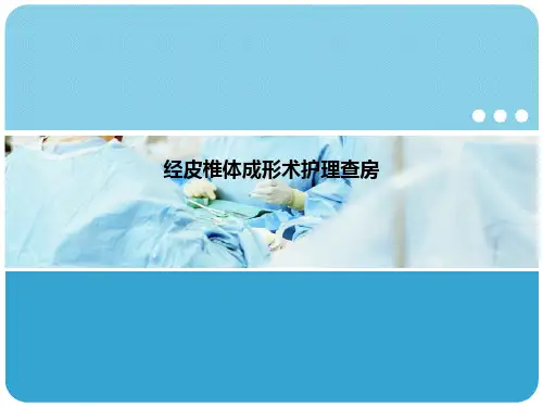 思考题:1.胸腰椎的解剖有哪些特点?2.胸腰椎骨折的类型有哪些?3.胸腰椎骨折的手术方法有哪几种?4.“经皮椎体成形术”适应证和禁忌证有哪些?5.试述如何进行碘过敏实验?引起碘过敏的途径有哪些?6.碘过敏的临床表现有哪些?应如何处置?7.什么是骨水泥植入综合征?护士长:各位同事,下午好!"经皮椎体成形术"(PercutaneousVertebropIasty,PVP)和"经皮椎体后凸成形术"(PercutaneousKyphopIasty,PKP)是近年来新发展起来的用于治疗椎体压缩骨折的微创型手术方法。