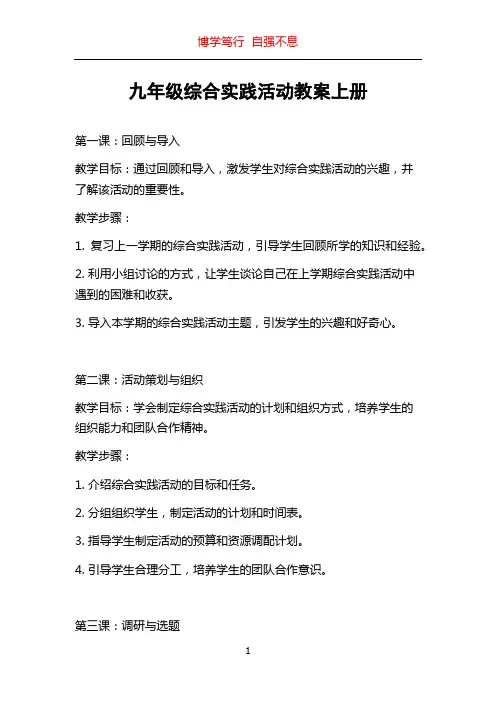 九年级(上)综合实践教案全套综合教案一、教学目标1. 知识与技能:学生能够通过综合实践活动,巩固和拓展所学的知识,提高解决问题的能力。