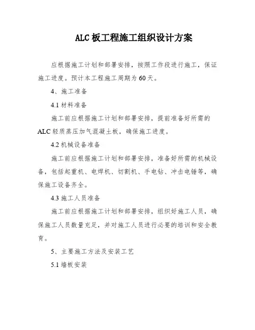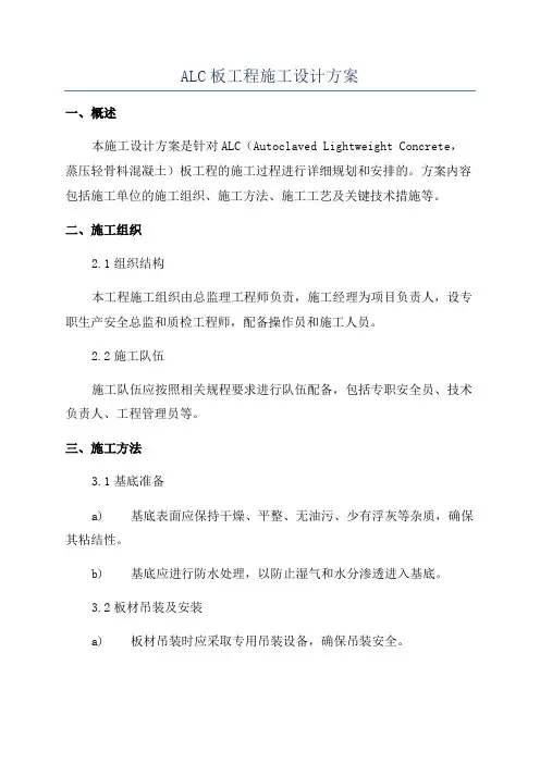 蒸压轻质加气混凝土板—ALC板施工方案简介蒸压轻质加气混凝土板,也被称为ALC板,是一种轻质、高强度的建筑材料,常用于墙体和屋顶的施工。