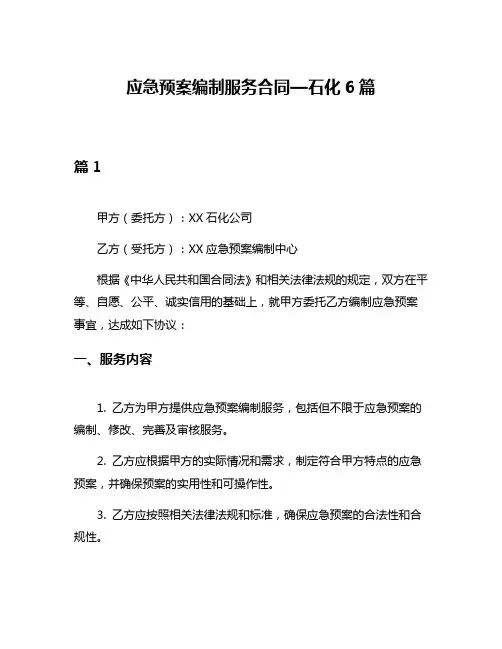 应急预案编制服务合同—石化6篇篇1甲方(委托方):XX石化公司乙方(受托方):XX应急预案编制中心根据《中华人民共和国合同法》和相关法律法规的规定,双方在平等、自愿、公平、诚实信用的基础上,就甲方委托乙方编制应急预案事宜,达成如下协议:一、服务内容1. 乙方为甲方提供应急预案编制服务,包括但不限于应急预案的编制、修改、完善及审核服务。