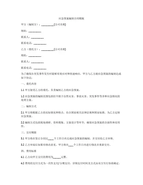 应急预案编制合同模版甲方(需方):________________乙方(供方):________________鉴于甲方需要制定应急预案以提高应对突发事件的能力,保障人员安全和减少财产损失,现委托乙方提供应急预案编制服务。