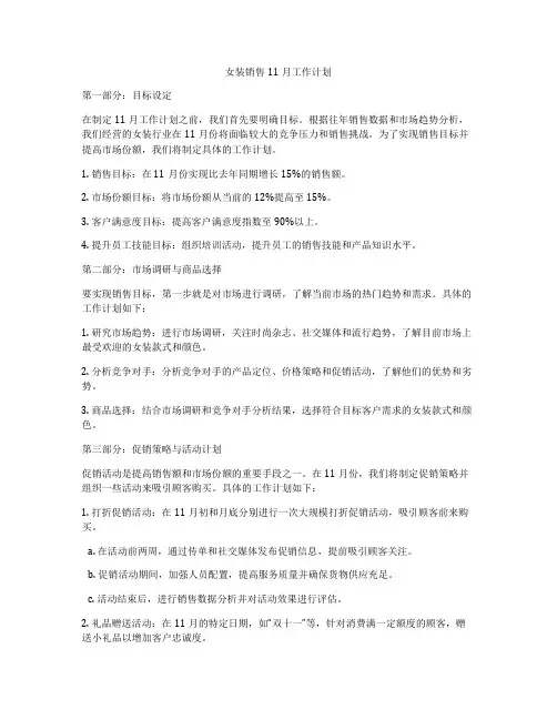 十一月服装销售工作计划篇一:十一月销售工作计划十一月销售工作计划十一月销售>工作计划(一)我十月中旬刚接触***电话销售业务,由于我在思想上急于求成,在行动上蛮干莽撞导致十月工作成绩毫无起色。