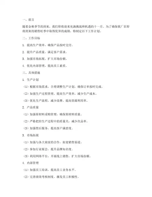二、销售目标1. 提高销售额:通过十一黄金周期间的推广和促销活动,力争在去年同期基础上提高销售额。