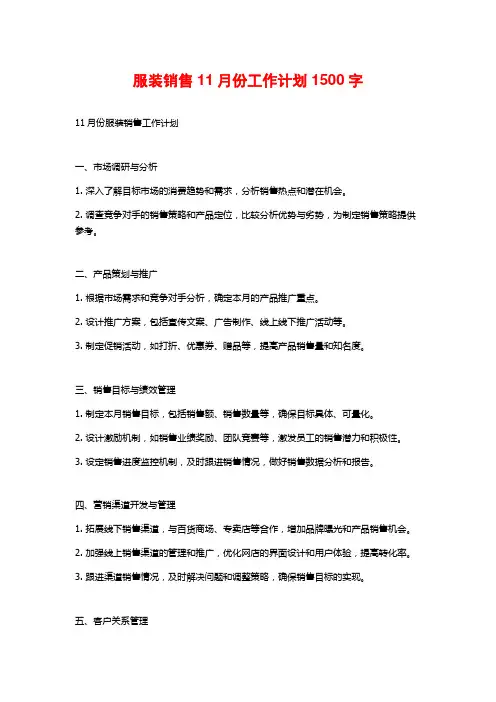 服装销售11月份工作计划1500字11月份服装销售工作计划一、市场调研与分析1. 深入了解目标市场的消费趋势和需求,分析销售热点和潜在机会。