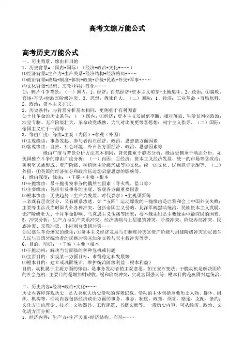 高考文综万能公式高考历史万能公式一、历史背景、原因和目的1、历史背景=(国内+国际)(经济+政治+文化+……)⑪经济背景=生产力+生产关系+经济结构+经济格局+……⑫政治背景=政局+制度+体制+政策+阶级+民族+外交+军事+……⑬文化背景=思想、宗教+科技+教育+……如:鸦片战争背景:(一)国内:1、经济:自然经济+资本主义萌芽+土地集中。