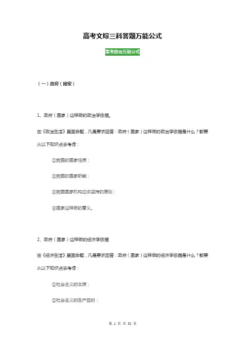 高考文综三科答题万能公式高考政治万能公式(一)政府(国家)1、政府(国家)这样做的政治学依据。