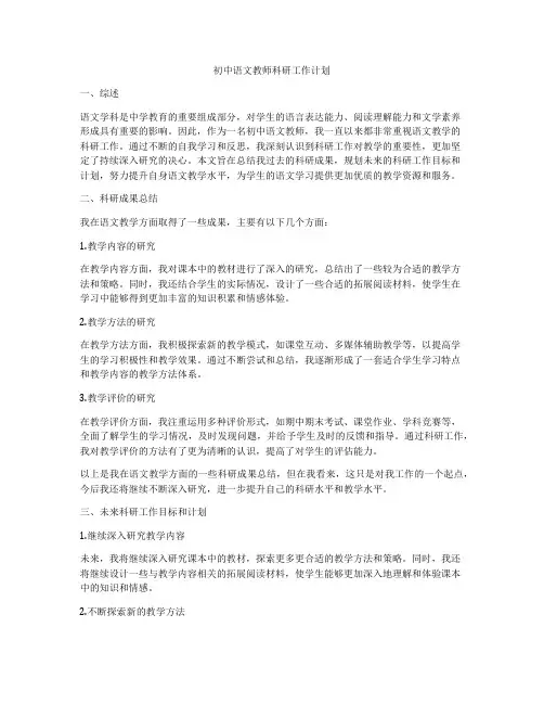 初中语文教师科研工作计划一、综述语文学科是中学教育的重要组成部分,对学生的语言表达能力、阅读理解能力和文学素养形成具有重要的影响。
