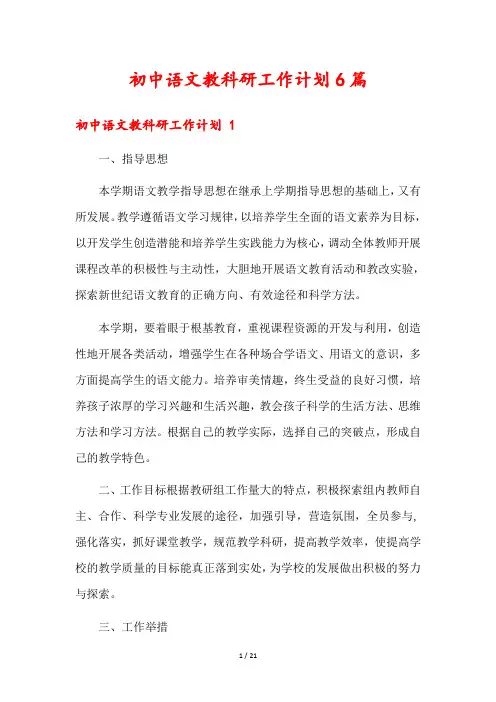 初中语文教科研工作计划6篇初中语文教科研工作计划 1一、指导思想本学期语文教学指导思想在继承上学期指导思想的基础上,又有所发展。