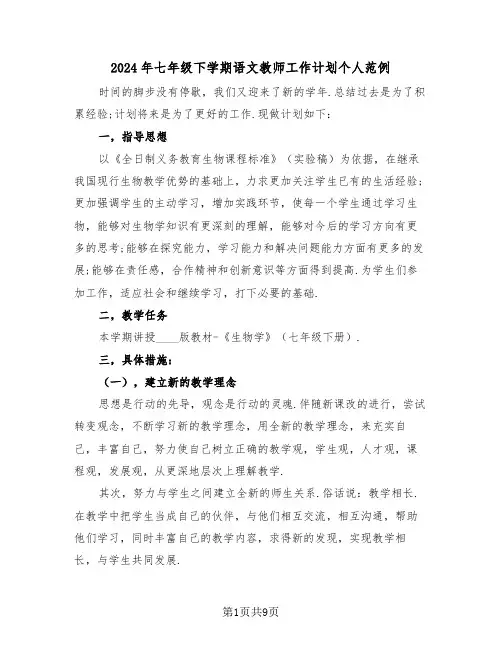 2024年初一语文教师个人教科研工作计划模板____年底的时候,2024年初一的语文教师个人教科研工作计划模板一、工作目标和背景1. 教学目标:提高学生的语文综合素养,培养学生的语言表达能力和文学鉴赏能力。